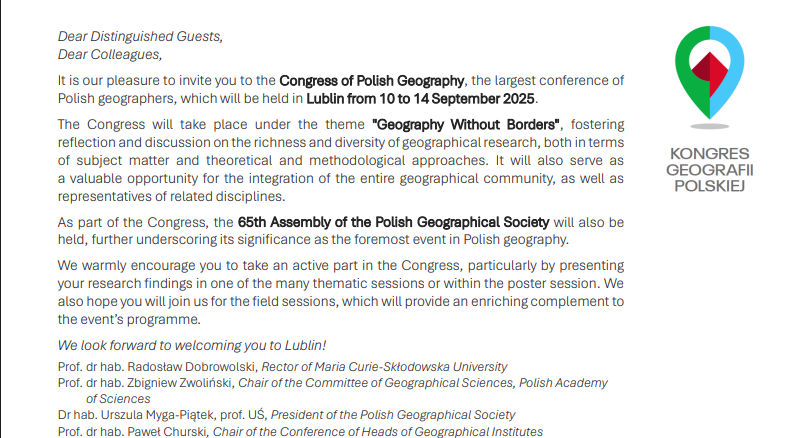 2) He is scheduled to give a plenary lecture at the 65th Assembly of the Polish Geographical Society, which is a part of the Congress of Polish Geography. The Congress of Polish Geography is the largest conference of Polish geographers, which will be held in Lublin from 10 to 14 September 2025. The theme of the Congress is "Geography Without Borders".