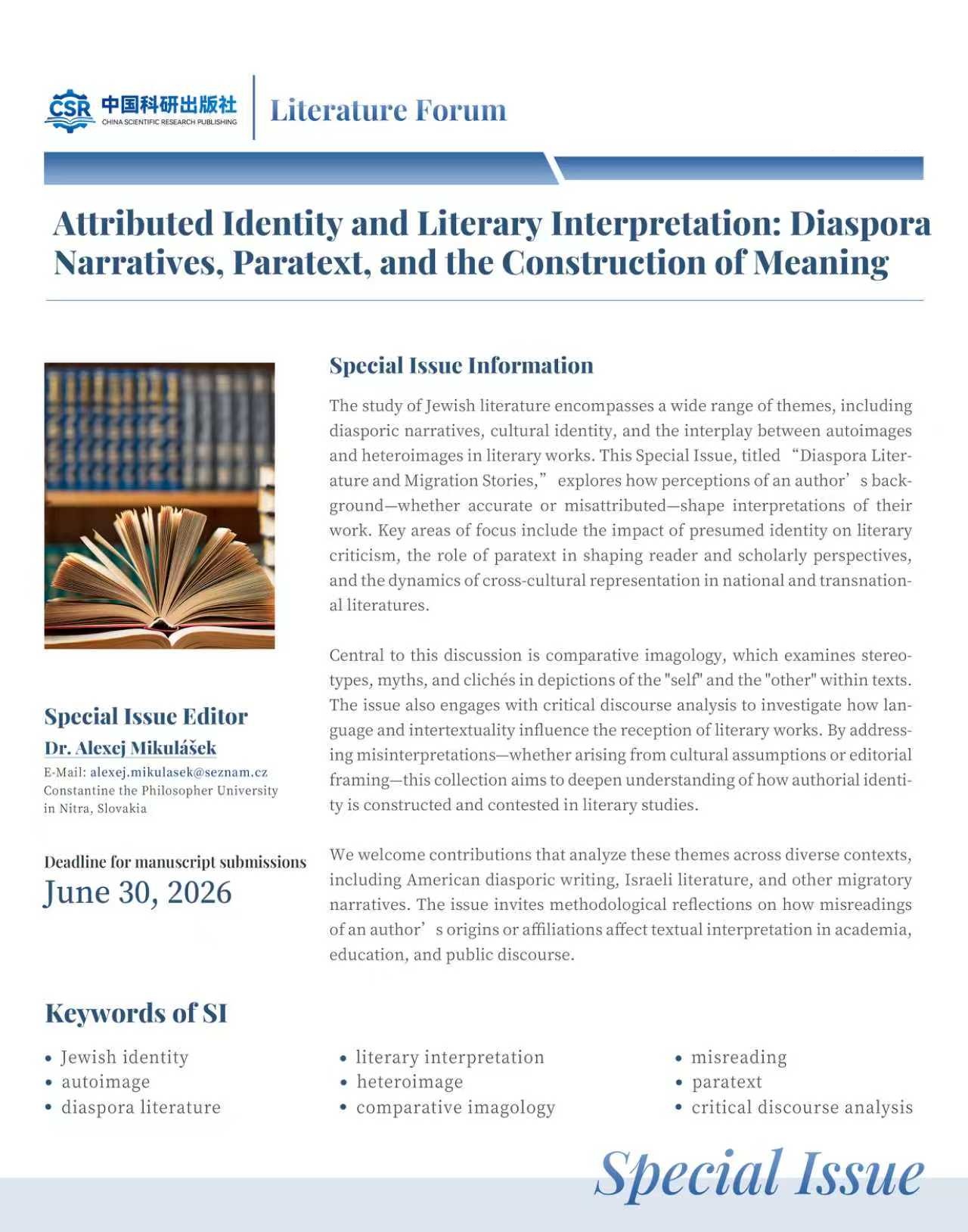 We welcome original research articles, reviews, and essays that explore themes related to diaspora literature, cultural identity, and literary interpretation. Topics may include but are not limited to Jewish identity, paratext, comparative imagology, and critical discourse analysis. Manuscripts should be submitted by June 30, 2026. For submission guidelines, please refer to the Special Issue website.